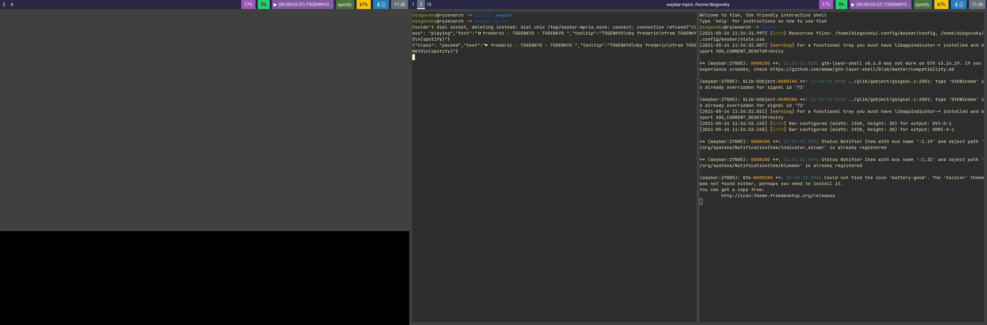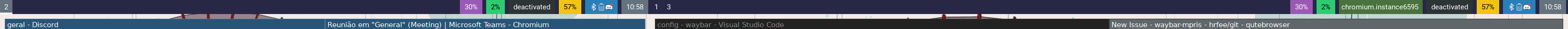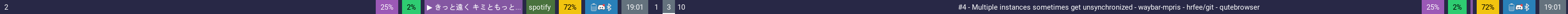 Hey there, just tested the fixed from #3 and it works wonderfully. However, I noticed sometimes the instances get unsynchronized and don't update accordingly. Currently, I have a dual monitor setup with two instances (player name and track info) in each monitor bar. Here's how it looks after I've watched a video on Qutebrowser (based on chromium I think):